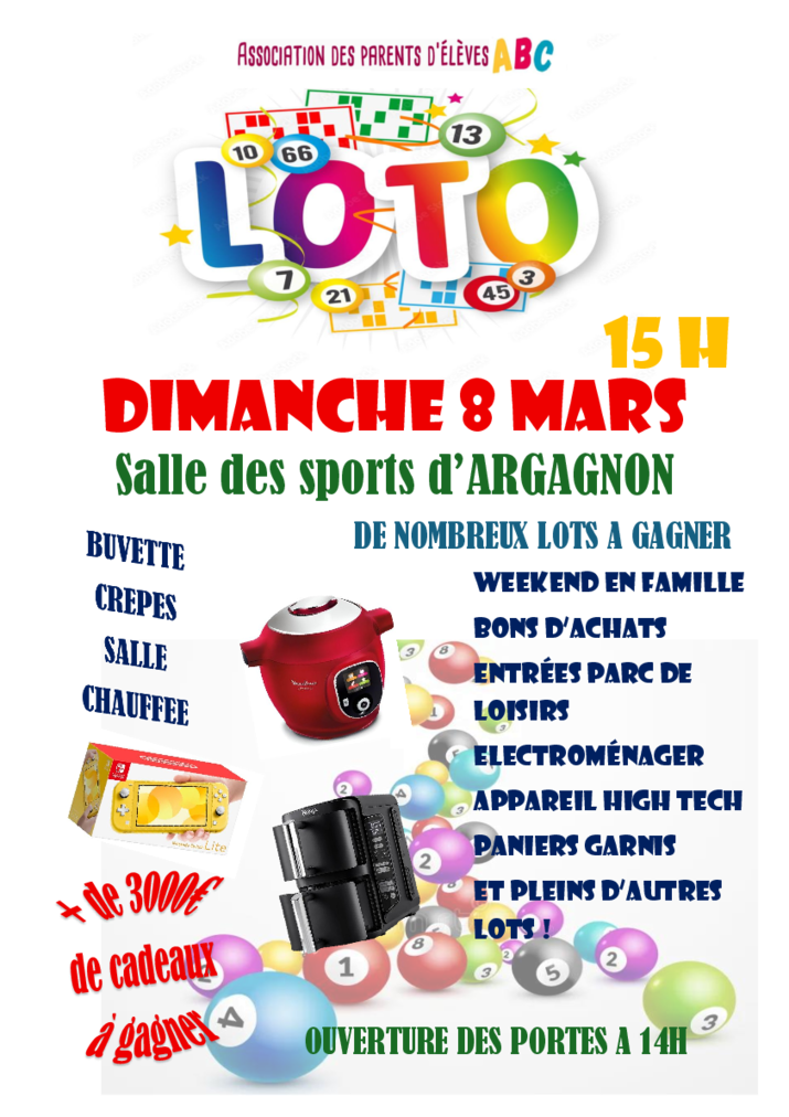 LE 08 MARS 2026, à la Salle Polyvalente d'Argagnon, aura lieu le Loto de l'Ecole, organisée par l'association des parents d'élèves ABC